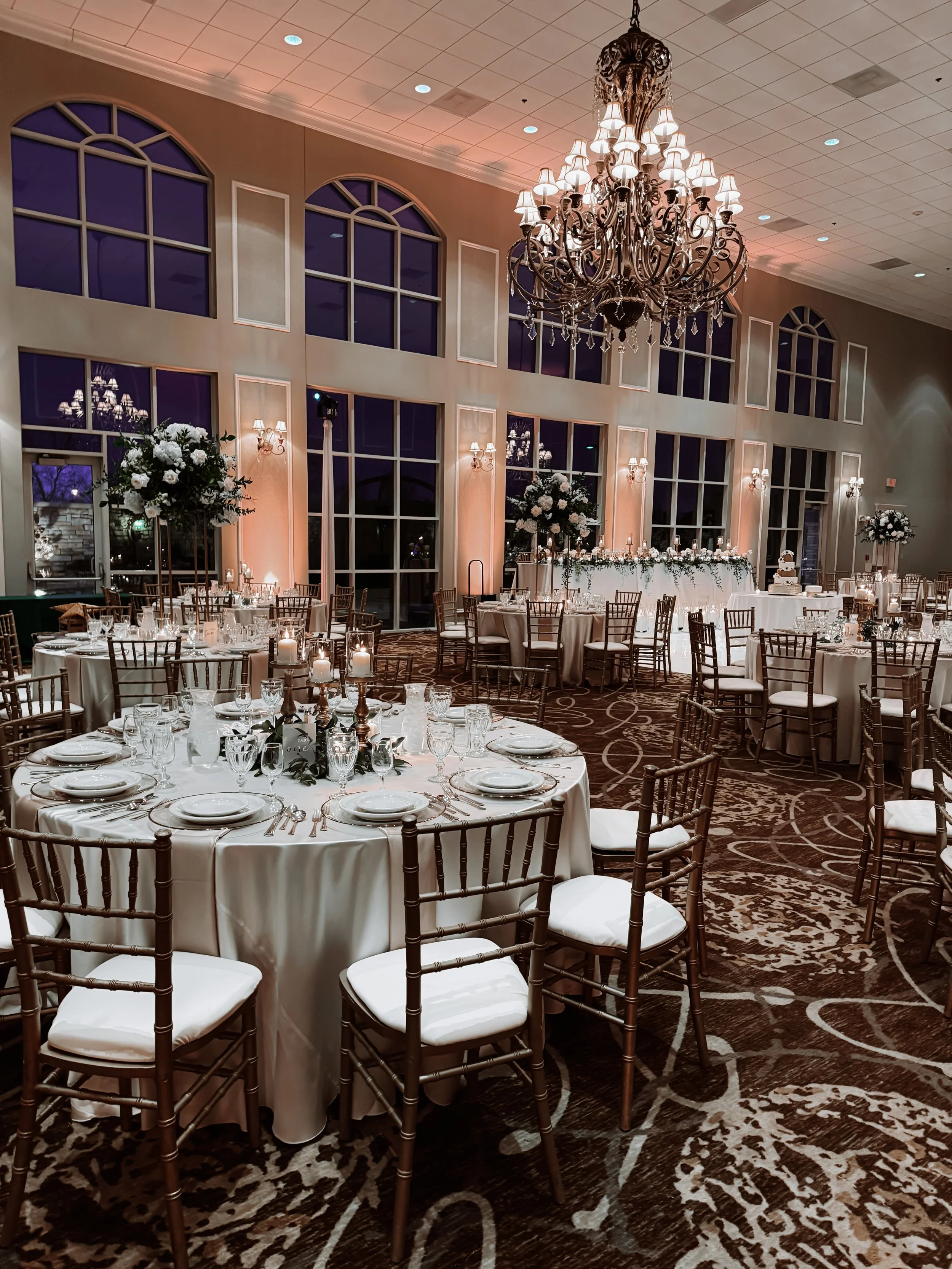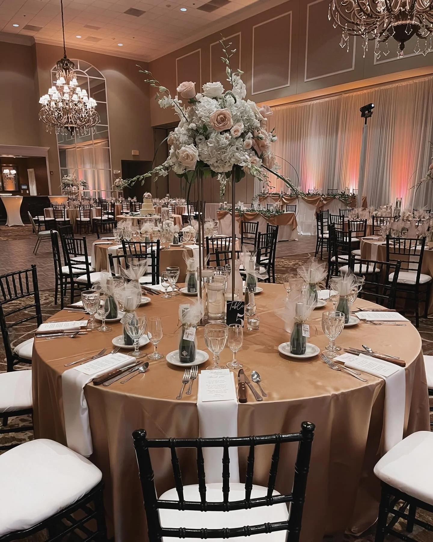 Satin Floor Length at Head Table, Cake Table, Guest Tables, and Entrance Tables